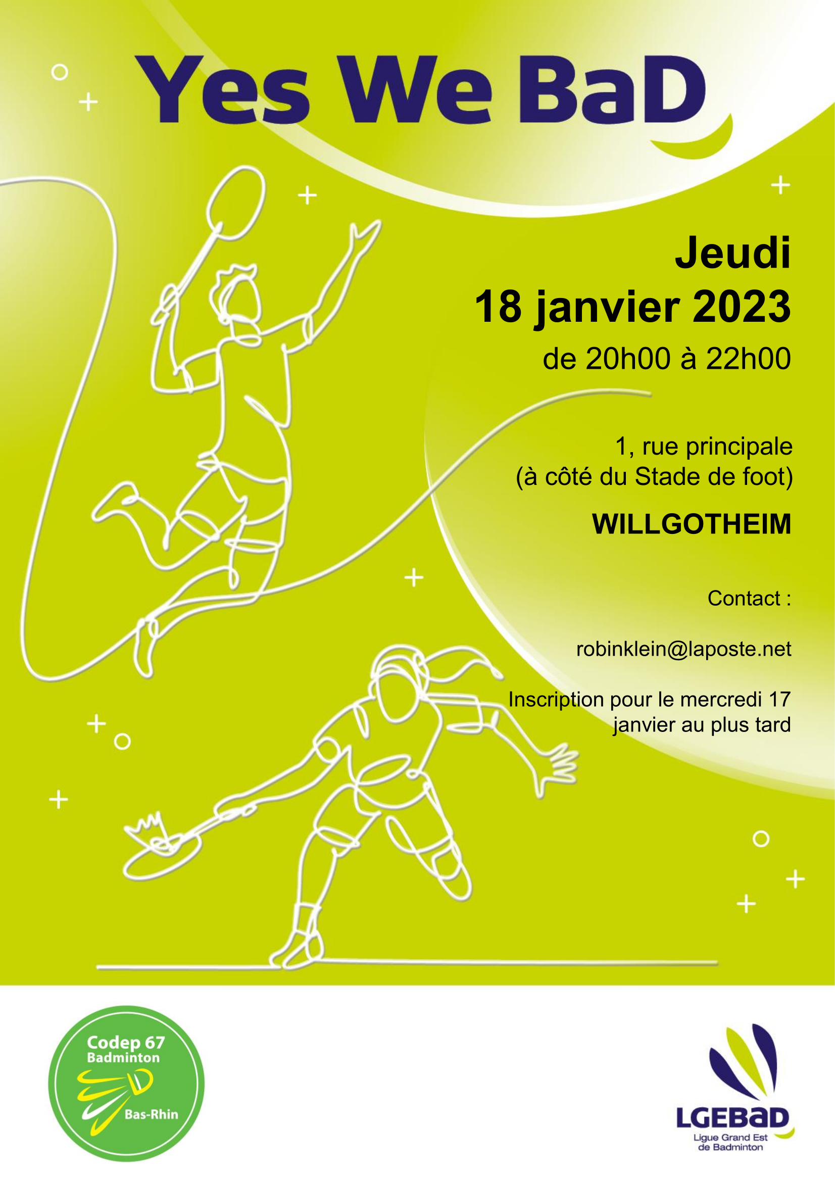 Affiche Joueurs loisirs Inscription avant le 17 janvier : robinklein@laposte.net Quand Jeudi 18 janvier 2024, 20h00 - 23h00 Catégorie de joueurs concernée Senior Vétéran Vétéran 1 Vétéran 2 Vétéran 3 Vétéran 4 Vétéran 5 Vétéran 6 Vétéran 7 Vétéran 8 A domicile Non concerné