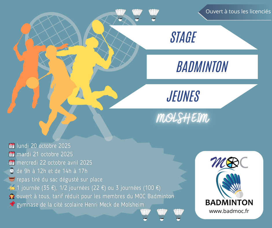 Le MOC Badminton de Molsheim organise pendant les vacances d'octobre un stage de badminton à destination de ses jeunes membres ainsi qu'aux licenciés des autres clubs.